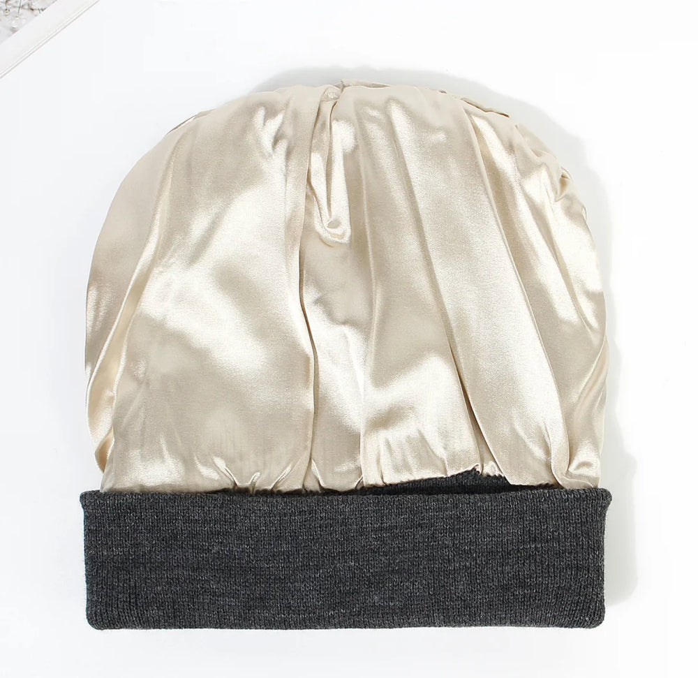 Silk satin lining protects hair while cozying you up.